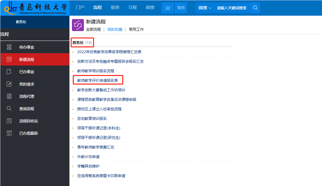 教师个人登录智慧青科大→应用中心→业务系统→办公自动化(OA)→流程→新建流程→教务处→填写教师教学评价申请报名表(如下图)。